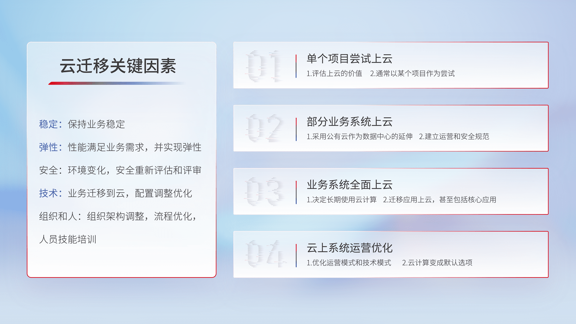 结合实际业务,,从规划设计、、、、云平台选型、、、云原生改造、、、、数据迁移、、、、集成交付,,,,迁移全过程为客户识别最佳上云路径,,,做好风险识别管理,,,设计网络架构、、、身份权限、、安全审计合规、、、操作审计、、、日志审计、、监控告警策略、、多站点容灾设计等,,对云上基础设施进行整体规划,,提升IT治理水平,,以满足弹性、、、、高可用、、、、高性能的需求。。。。