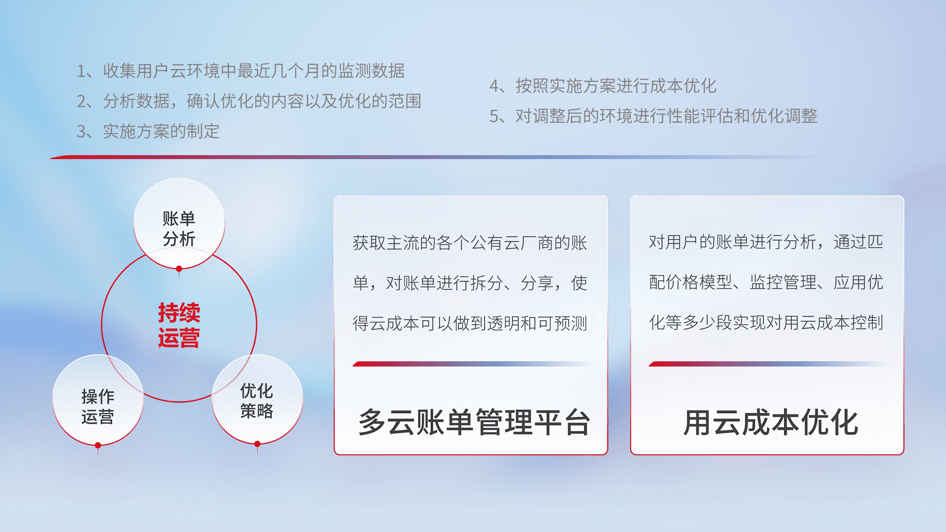 通过多云纳管,,,,以统一的资源数据模型把客户的云资源进行抽象和封装,,进而实现对多云资源的统一操作,,保障云资源管理的可靠性、、稳定性与可用性。。。量身定制化运维内容,,,,配置、、、开发运维、、补丁管理、、、备份、、、监控、、、、认证和访问管理、、、、审计和日常巡检等,,,保障在用云过程中的可靠度,,稳定度以及高可用率。。。。